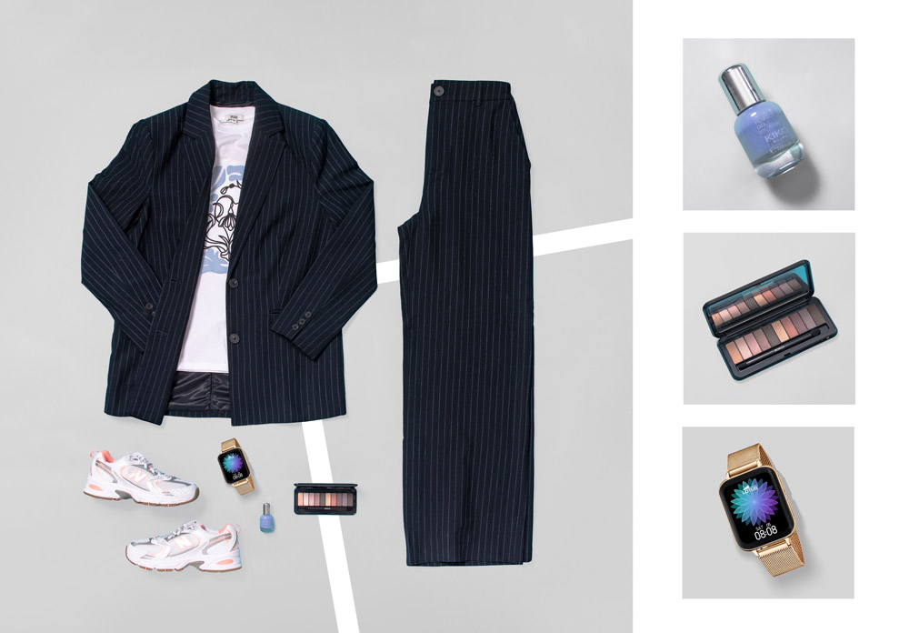 Ce look ultra tendance se compose notamment d’un tailleur bleu foncé qui vous assurera confort et élégance, associé à un t-shirt graphique et des baskets blanches pour une touche de modernité et de fraîcheur. Et comme un style est aussi affaire d’accessoires, complétez le tout avec un joli vernis à ongle bleu accordé à votre haut pour un rappel subtil et pétillant, une palette de maquillage aux tons raffinés pour appuyer votre regard. Enfin, une montre digitale dorée pour habiller votre poignet et perfectionner votre aura de workeuse dynamique !